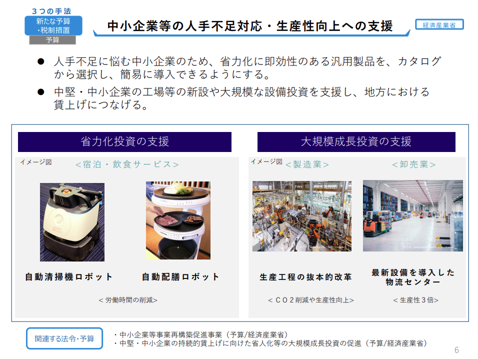 中小企業省力化投資補助事業は、カタログに掲載された汎用製品からの選択式であることから、省力化に資する製品・設備の規模の点で異なると想定されます。