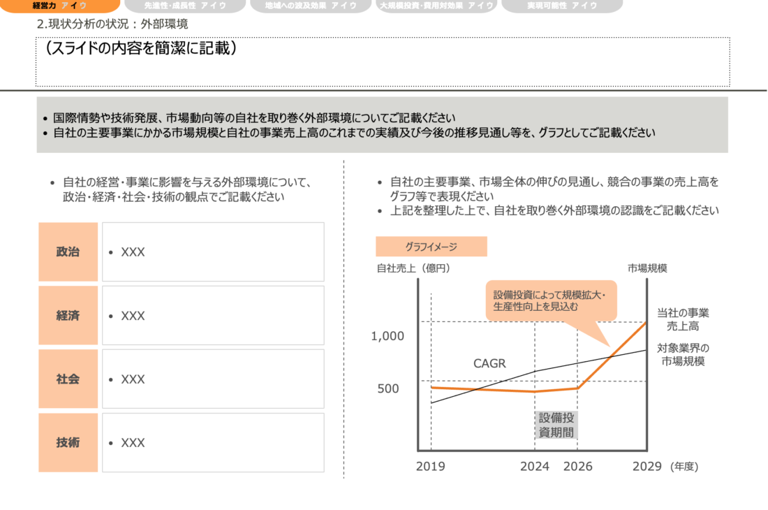 大規模成長投資補助金の成長投資補助金のフォーマットはワードではなくパワポです。フォーマットが異なることからも、ワード形式で審査される、事業再構築補助金やものづくり補助金とは、作成方法も大きく異なります。パワポ形式の場合、簡潔かつ要点を押さえて記載することが一般的です。パワポ形式で計画書を策定した経験が乏しいコンサルタントは、①蓋然性が乏しい情報が無駄に含まれている②情報が整理されていない③要点が不明確 といった致命的なミスをしがちです。難解なビジネスモデルを説明する場合は、文量を要すこともあります。こうした場合であっても、図表を活用することで視覚的に整理できるよう工夫する必要があります。