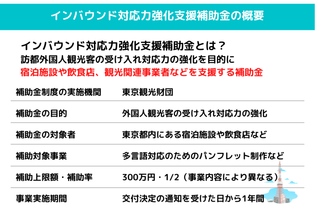 インバウンド対応力強化支援補助金は、東京都内の宿泊施設や飲食店、免税店などを対象に、外国人旅行者の受け入れ環境の整備を目的とした補助金です。