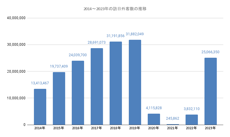 日本に訪れる外国人観光客の数は、新型コロナウイルス感染症の影響で2020年~2022年は大きく落ち込みましたが、2023年は復調の兆しを見せています。