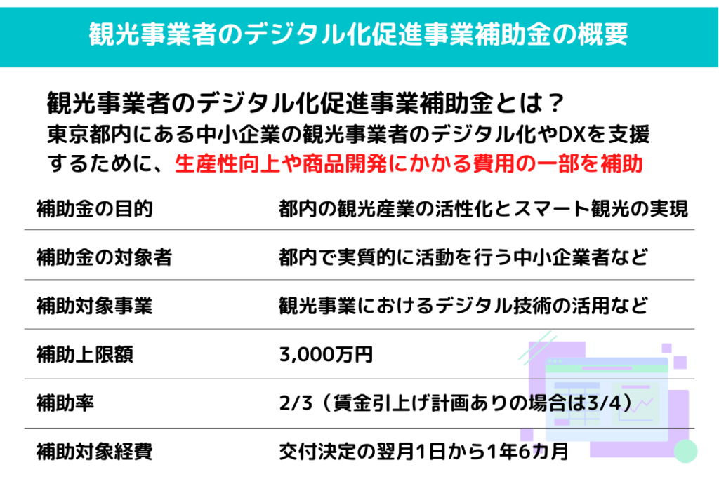 東京都および東京観光財団が実施するこの補助金は、都内の中小企業の観光事業者を対象に、デジタル技術を活用したサービスの導入にかかる費用の一部を補助するものです。