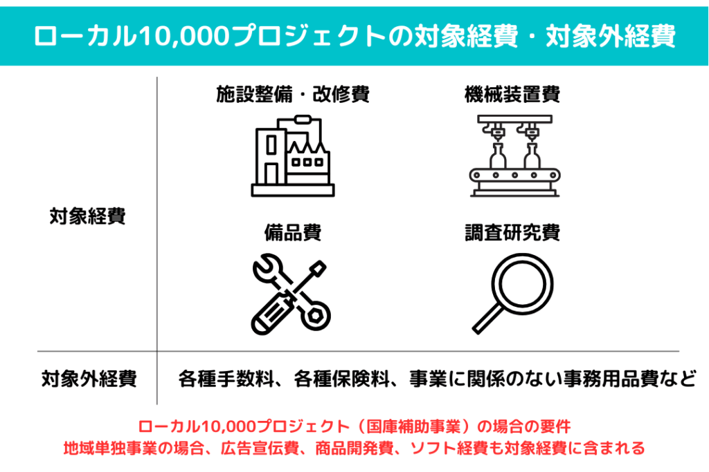 なお、ローカル10,000プロジェクト(地方単独事業)については、広告宣伝費、商品開発費、事業分析・再構築費などのソフト経費も1事業あたり上限200万円まで対象となります。