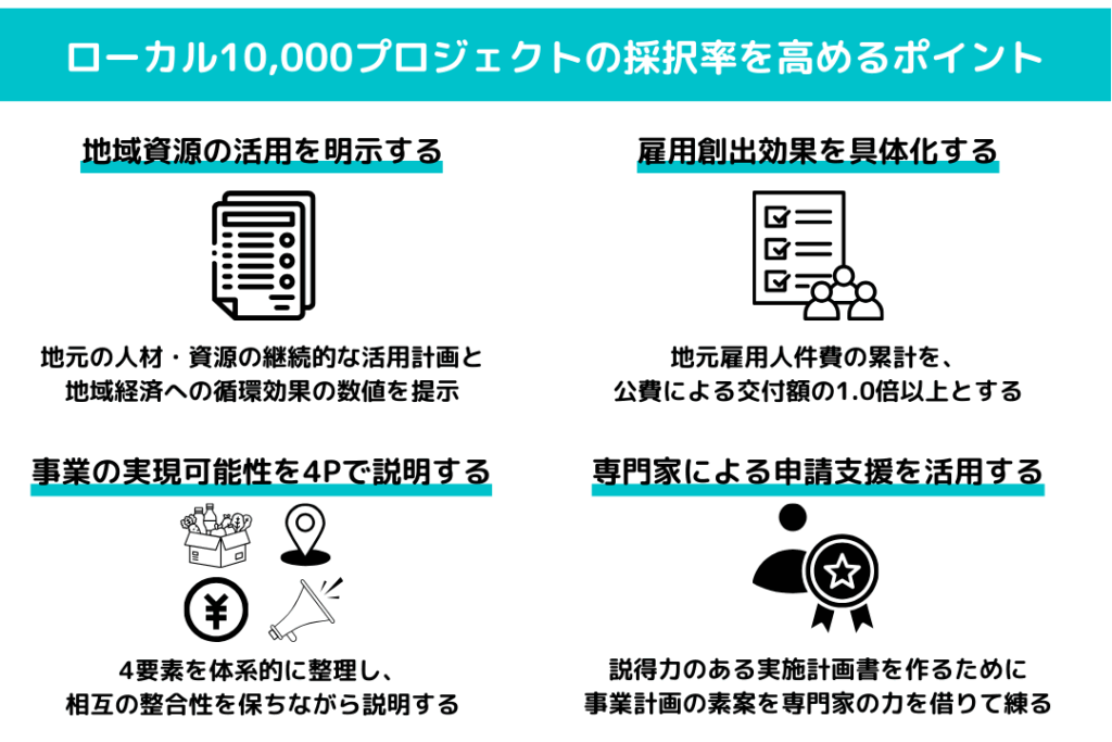 ローカル10,000プロジェクトの採択率を上げるには、地域資源の活用について具体的に明示することが重要です。