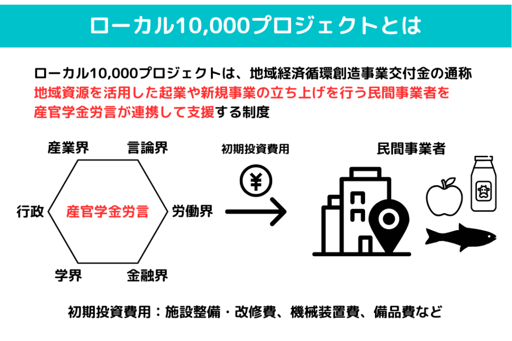 ローカル10,000プロジェクトとは、総務省が設けた「地域経済循環創造事業交付金」の通称で、産官学⾦労⾔(産業界・行政・学界・金融界・労働界・言論界)の連携によって、地域資源を活用した起業や新規事業の立ち上げを行う民間事業者を支援する制度です。