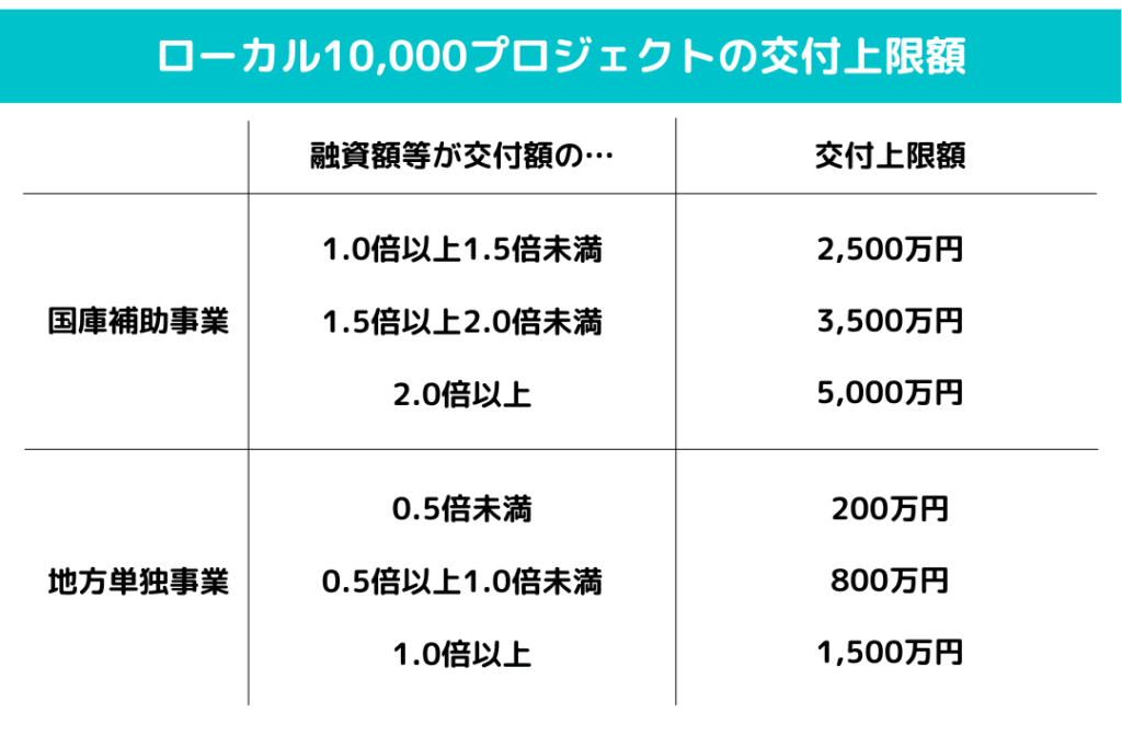 また、ローカル10,000プロジェクトは、地域金融機関からの融資等が必須要件となっている点も、ほかの制度とは大きく異なる点です。融資額と公費の比率により交付上限額が決まる独特な仕組みを採用しており、民間資金の活用を重視しています。