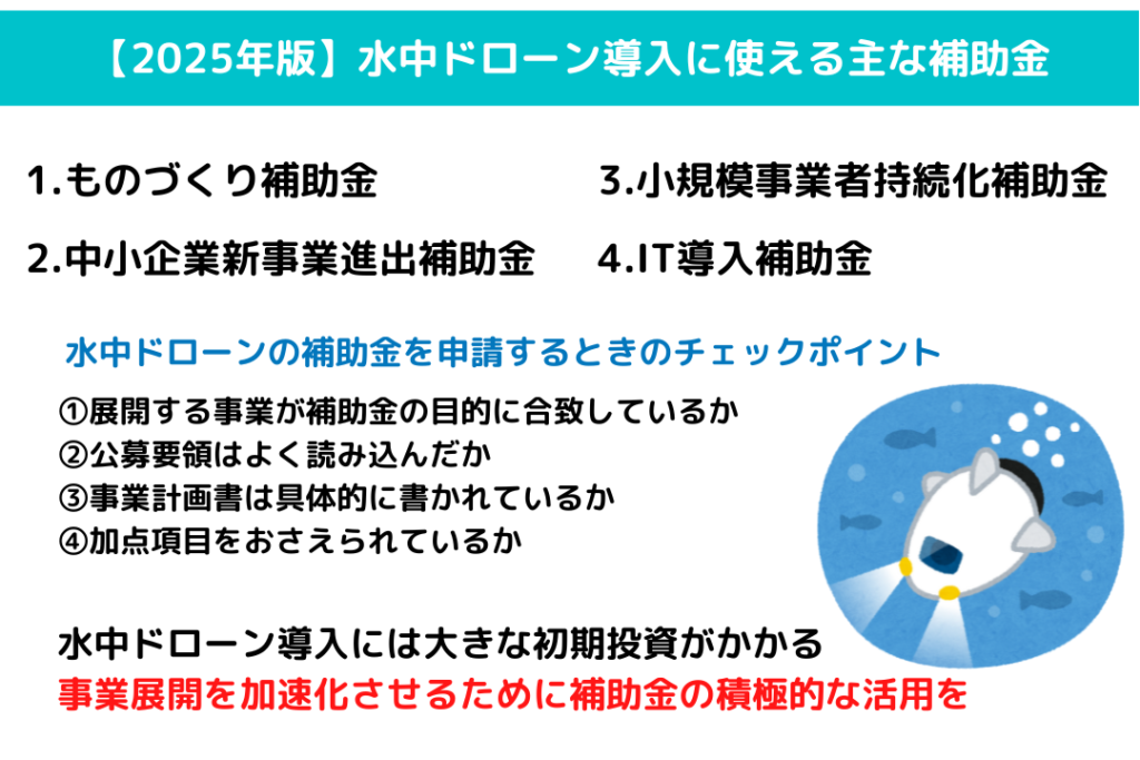 水中ドローンの導入を支援するため、国はさまざまな補助金制度を用意しています。ここでは、代表的な制度を4つ紹介します。