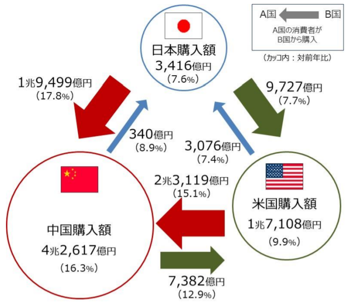 令和2年、中国から日本の商品の購入額が1兆9,499億円、前年対比17.8%増という結果になりました。(参考:経済産業省 電子商取引に関する市場調査の結果を取りまとめました。
