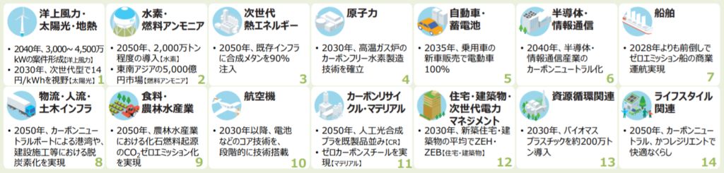 これは2050年のカーボンニュートラルに向けて、成長が期待される14個の分野に高い目標を掲げて実施するものです。