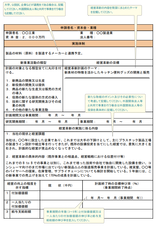 記載にあたっては、まず申請者名、資本金、業種を明記し、実施体制欄には大学や公設試験研究機関、他企業との連携内容を記載します。新事業活動の類型は、新商品の開発、新役務の提供など6つの類型から該当するものに丸印を付けます。