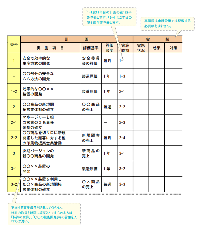 (別表2)実施計画と実績は、経営革新計画の進捗管理のためにPDCAサイクルに基づいて作成する重要な書類です。「計画」欄には、実施項目を番号で階層化して記載し、定量的な評価基準、評価頻度、実施時期を明記します。「実績」欄は申請時には記載不要ですが、計画の進捗に応じて◎○△✕を記載し、必要に応じて対策を記入します。