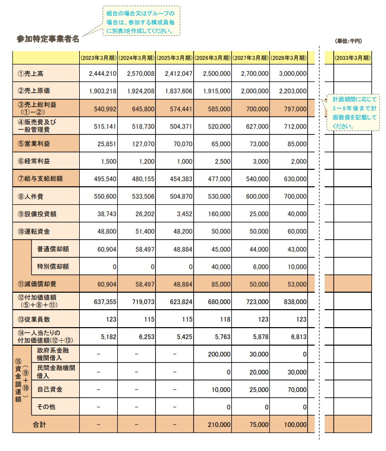 | (別表3)経営計画及び資金計画 | 売上高、営業利益、人件費等の経営計画と資金計画(過去3年と計画期間) |