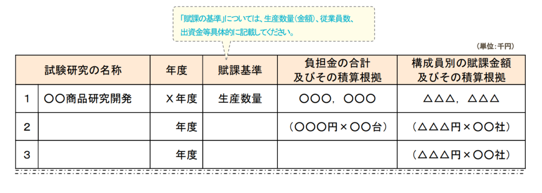(別表5)組合等が研究開発等事業に係る試験研究費に充てるためその構成員に対して賦課しようとする負担金の賦課の基準は、組合等が共同で研究開発を行う際に、構成員から負担金を徴収する基準を定めるものです。研究開発の名称、年度、賦課基準、負担金の合計額とその積算根拠、構成員別の賦課金額とその積算根拠を明記します。賦課基準は、生産数量(金額)、従業員数、出資金等の具体的な記載が必要です。この書類は組合等が研究開発事業を実施する場合のみ必要となります。