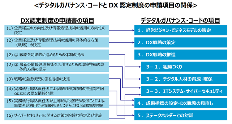 デジタルガバナンス・コードと DX認定制度の申請項目の関係 出典:DX認定制度申請要項 別添資料1. 制度概要 p.2|IPA
