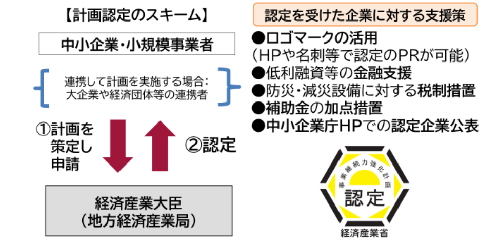 事業継続力強化計画は中小企業強靱化法に基づき、申請して要件を満たせば経済産業大臣から認定を受けることができます。認定を受ければ補助金の加点措置や税制優遇などのメリットも得られます。