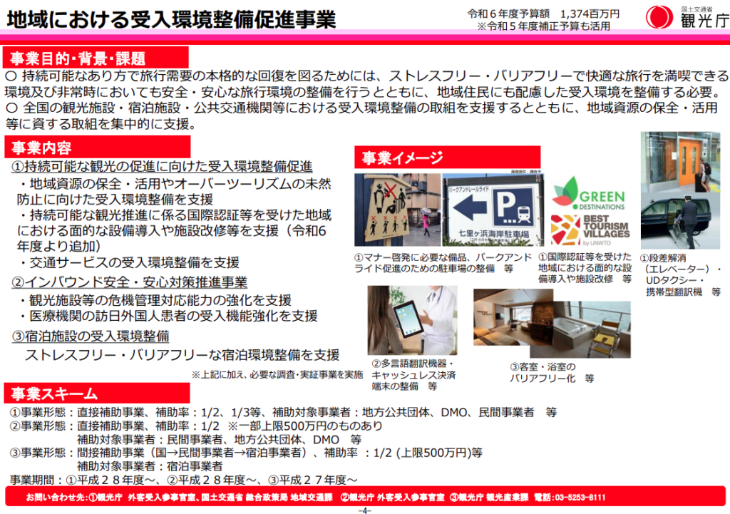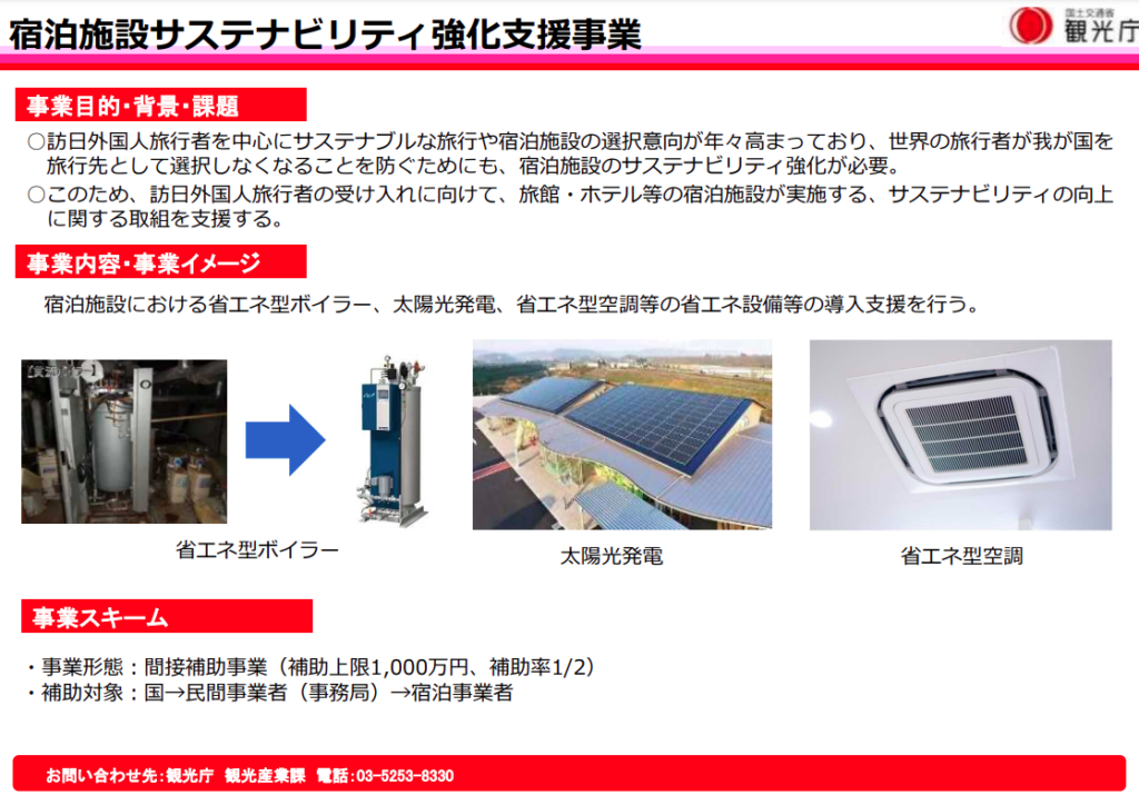 国内旅行に続いて、インバウンド旅行客も回復しつつある状況の中、インバウンドの本格化に備え、宿泊施設や観光施設のサステナビリティ向上への取り組みを促進することを目的としています。